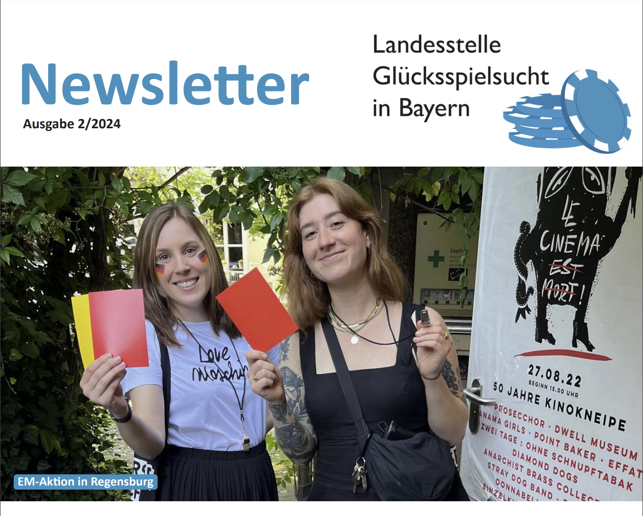 Freuen Sie sich auf viele spannende und interessante Beiträge rund um das Thema Glücksspiel(sucht). In dieser Ausgabe finden Sie alles Wichtige zu unserem Fachstellenbericht und dem Bericht zur türkischsprachigen Hotline. Außerdem gibt es Neuigkeiten aus Prävention, Forschung und Praxistransfer. Und besonders freuen dürfen Sie sich auf zwei tolle Bilderstrecken zu unseren Aktionen zur EM 2024 und zum bundesweiten Aktionstag gegen Glücksspielsucht Ende September.